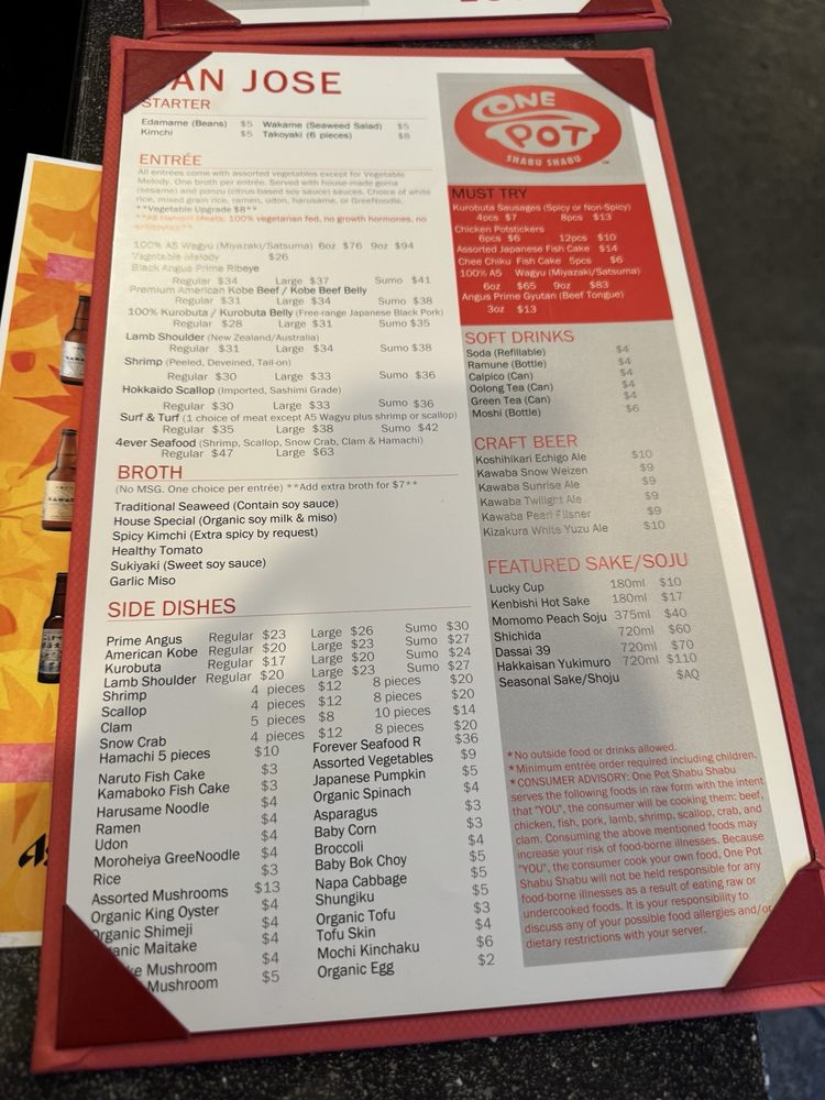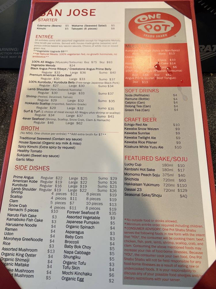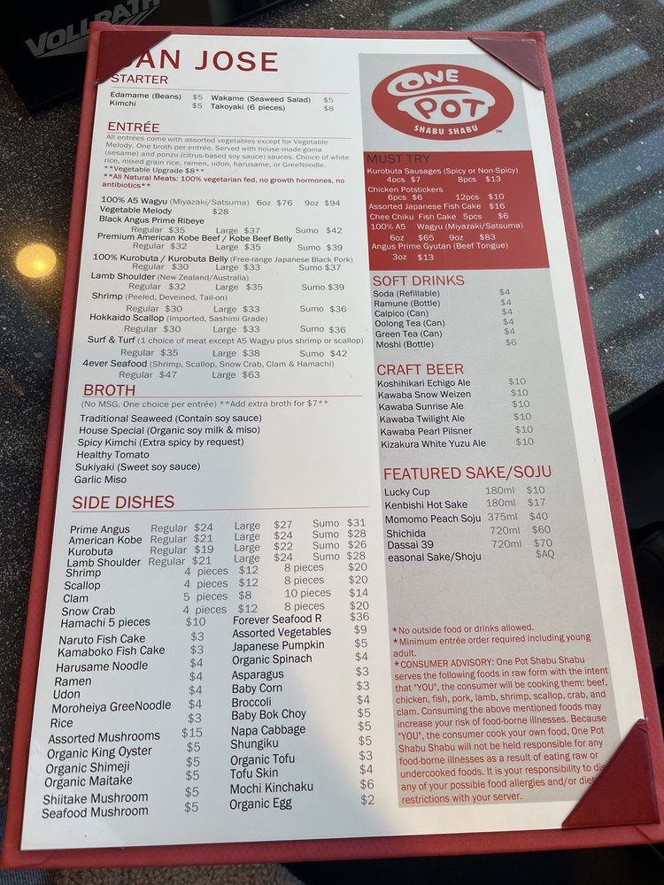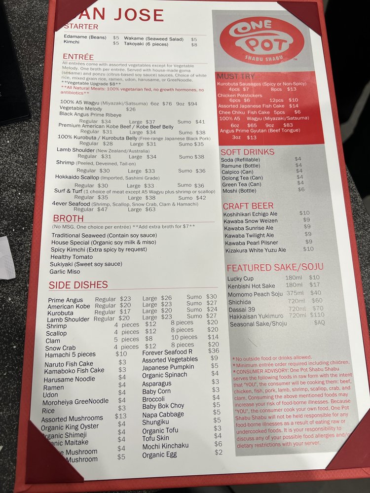 One Pot Shabu Shabu in San Jose offers a trendy, casual dining experience with a wide array of options for Japanese hot pot enthusiasts. Located at 5120 Cherry Ave Ste 10, this restaurant provides takeout, reservations, and delivery services, making it convenient for customers. The menu boasts delicious items like Wagyu, Angus Prime Gyutan, and Assorted Fish Cake. The broth selection includes options like Garlic Miso and Spicy Kimchi, catering to different flavor preferences. Customers praise the quality and consistency of the food, with highlights such as the Kobe Beef Belly and Gyutan (beef tongue). The spacious, accommodating ambiance is ideal for group gatherings, while the attentive service adds to the overall dining experience. Whether you're a fan of hot pot or looking to try something new, One Pot Shabu Shabu is a must-visit spot in San Jose.